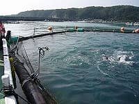 朝食を取って早速「本まぐろ養殖体験」の為、大島漁港へ向かいます。のどかな田舎の漁港でこの辺りでは鯛の養殖が盛んなようです。いざ、2艘の漁船に分かれて乗り込み10分ほどで養殖場へ到着です。