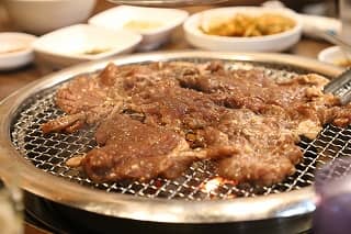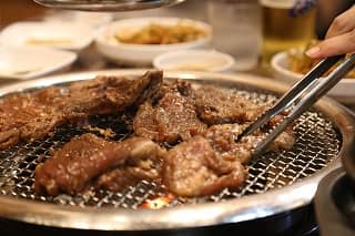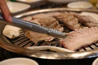 サムギョプサルとは豚肉の焼肉のことで、みそダレを付けてサンチュという葉に巻いて食べます。