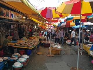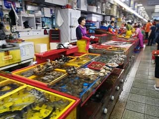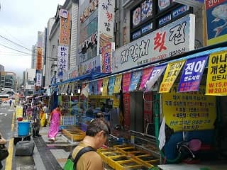 韓国一の魚介類専門市場。1階でいろいろと物色し、2階へ上がれば食堂があり、湾が一望できます。また、建物の外にも鮮魚販売の露店がいっぱいひしめいていて見ているだけでも楽しいです。