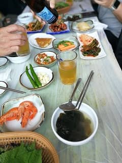 その他にも骨付きカルビやチゲと共に美味しい夕食、もちろん付け合せにキムチがいっぱいついてきます。