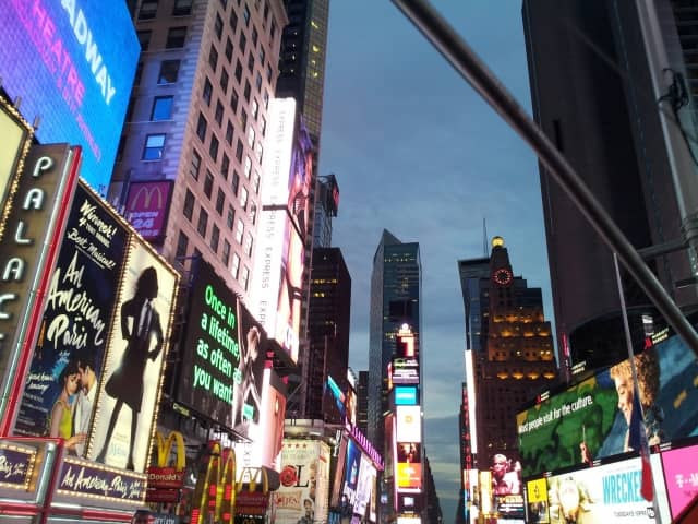 企業やミュージカルの巨大な広告やディスプレイ、ネオンサインが有名な42ストリートと7アヴェニュー、ブロードウェイの交差点です。観光案内所やお土産物屋さん、飲食店が多くひしめいています。地下鉄の路線がいくつも交差していて、地下でもすごい階層になっています。